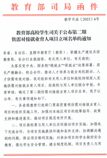 为落实党中央、国务院“稳就业”“保就业”决策部署,深化产教融合、校企合作,推动人才培养与就业有机联动、人才供需有效对接,教育部组织有关用人单位和高校实施供需对接就业育人项目。全国共有889所高职院校的4679个项目获得立项,beat365“定向人才培养培训项目”“就业实习基地项目”“人力资源提升项目”共计14个项目获批立项,全国排名第61位,河北省排名第3位。