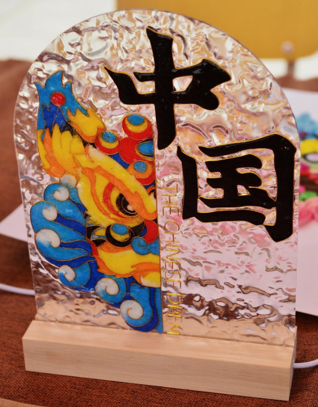 这款灯牌运用掐丝珐琅工艺,极具匠心。拱形造型搭配木质底座,古朴雅致。左侧以掐丝珐琅塑造醒狮形象,红、黄、蓝等色彩交织,生动展现醒狮的威武灵动,彰显传统文化活力。右侧“中国”二字传递深厚家国情怀。整体将传统工艺与现代设计融合,点亮后流光溢彩,是文化魅力与创意巧思的完美呈现。