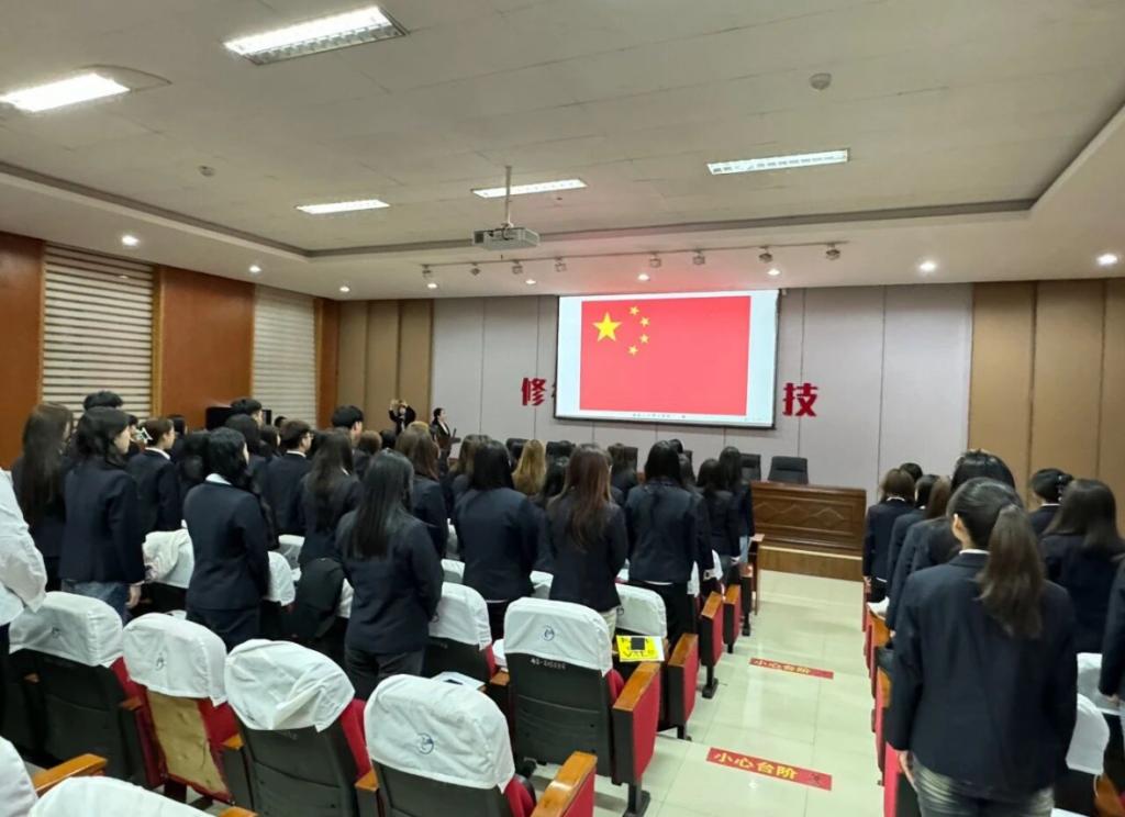 培训开篇,全体参会学生干部面向屏幕上的五星红旗肃立,齐唱国歌。庄严的旋律中,国旗的鲜红底色与“修德砺技” 的背景标语相呼应,让学生干部在仪式感中锚定 “以赤诚之心服务集体、以实干作风履职尽责” 的核心定位。