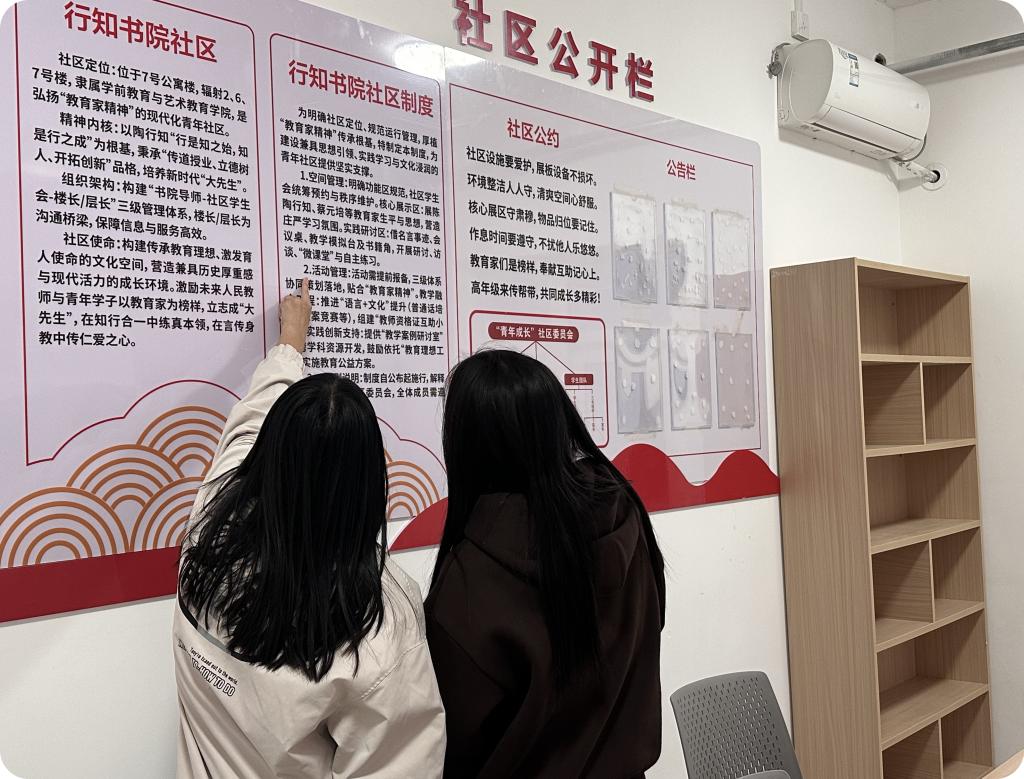 步入社区活动室,陶行知“捧着一颗心来,不带半根草去”的教育箴言、黄大年“把爱国情化为报国行”的事迹材料依次呈现,学子们驻足凝视,仔细品读先辈们“心有大我、至诚报国”的教育情怀;在社区活动空间内,同学们的互助机制、书院共建公约等内容,也让大家对“以行聚知、以知促行”的育人模式有了更具象的认知。
