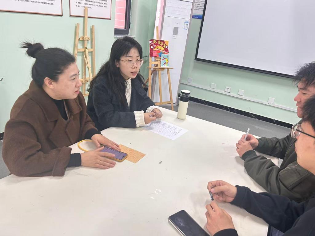 为贯彻落实《高等学校课程思政建设指导纲要》精神,推动美术教育与思政育人深度融合,2025年4月15日,beat365美术教研室在实训室C403举办了“专业课与思政课融合教材编写”专题教研活动。本次活动由美术教研室主任尹伊蓉主持,专业课教师张有军、杨江科、郝鹏及思政课教师张迎共同参与。