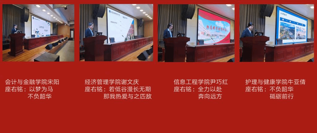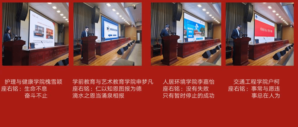 接着八名获得国家励志奖学金的学生代表分别从学习上、生活上、工作上讲述了自己的成长历程、收获和感悟。他们神采奕奕,精神饱满,展现出当代青年学子良好的精神面貌,鼓励大家能不断激励自己,拼搏向上,不辜负每个时刻的自己,把握好自己未来的船,成为方向的掌舵人,向更加美好的未来昂首向前。