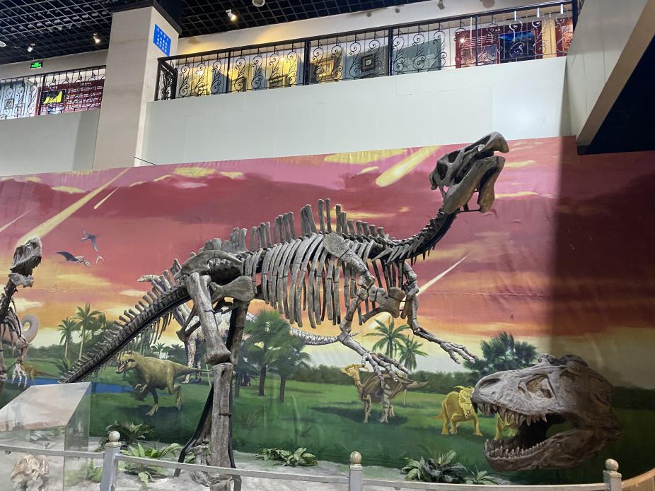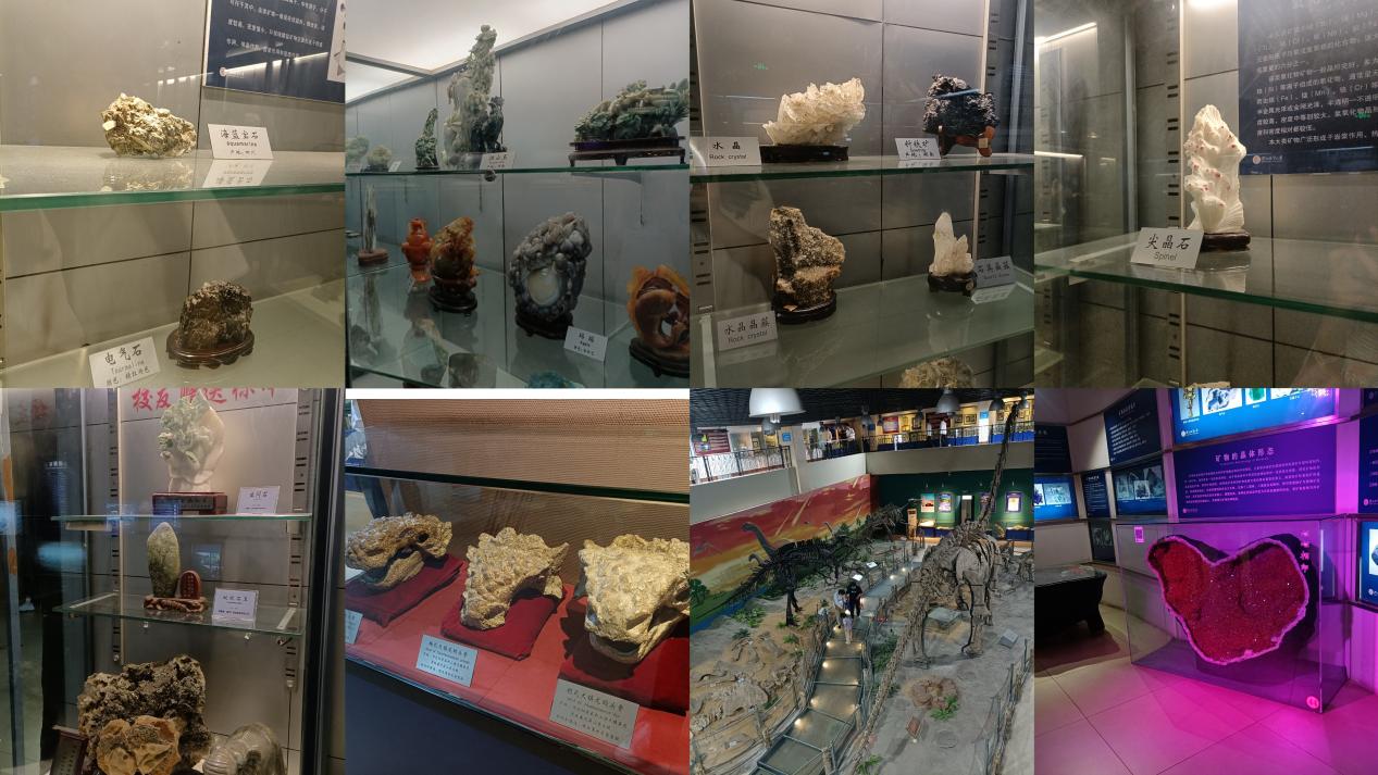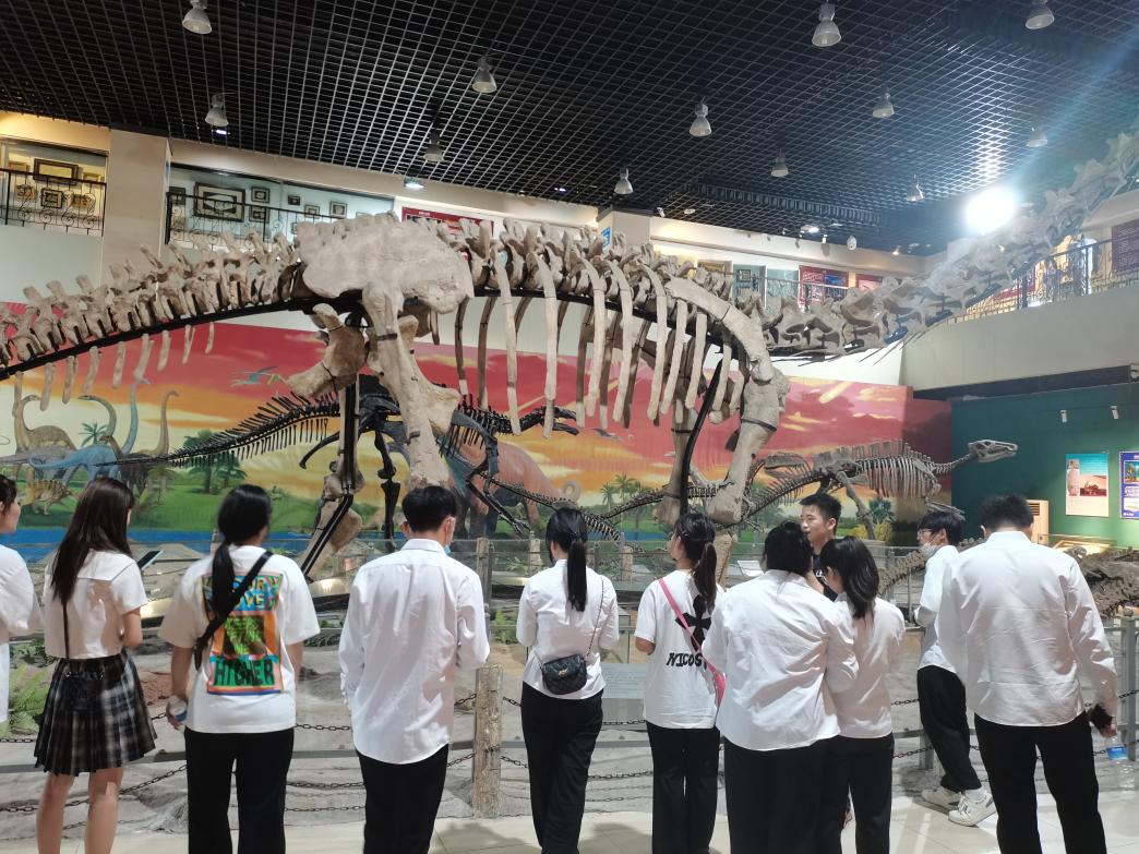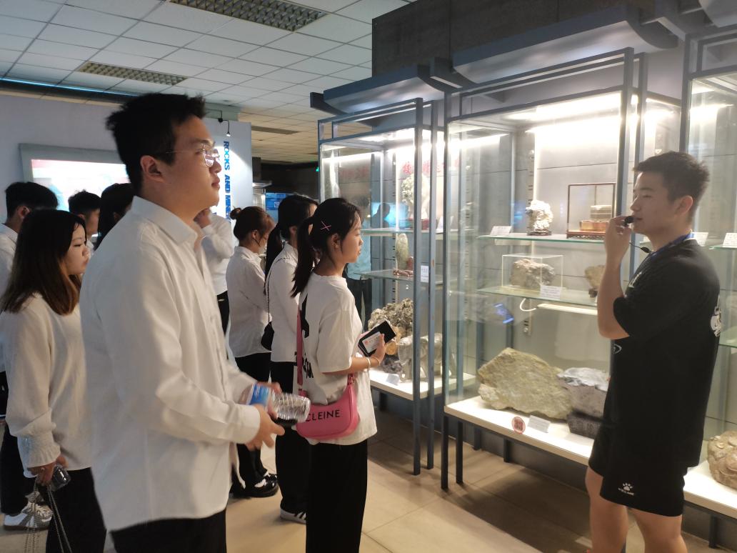 河北地质大学地球科学博物馆始建于1954年,根据建筑楼层分布,设立4个常设展厅。分别为:宇宙与地球厅,重点展示宇宙与地球的起源和组成;岩石矿物厅,展示三大岩类及矿物标本;宝石与矿产厅,主要展示天然珠宝玉石、人工宝石和各类矿产资源;恐龙与古生物厅,展示有九条恐龙的骨架和有关恐龙的起源、分类、特征、演化及灭绝,展示生命的起源和生物进化各阶段的珍稀化石。讲解员带领同学们依次对四个展厅进行参观学习,并对各项展品进行了详细介绍。
