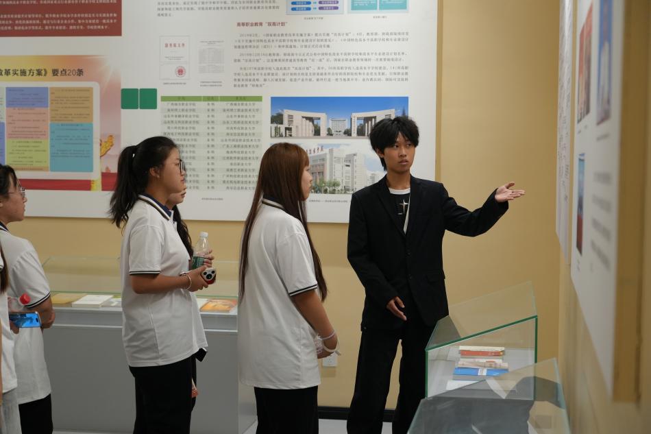 在中国职业教育展室,通过史料系统让同学们了解职业教育发展脉络,在一位位大国工匠精益求精的故事中,深刻领会习近平总书记“弘扬劳动光荣,技能宝贵,创造伟大的时代风尚”的重要论述,认识到职业教育在培养高素质技术技能人才、服务经济社会发展中的关键作用,进一步坚定了他们对职业教育的认同感与自信心。