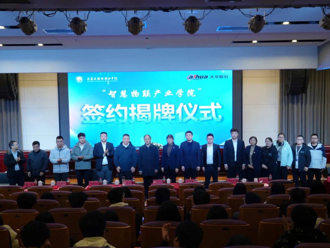 致辞结束后,在全场嘉宾的热烈掌声中,薛向东书记和大华公司区域经理李辉共同为“远程运营服务中心”揭牌,大华公司副总经理段成钢为 “智慧物联产业学院” 揭牌,李同鑫副校长和大华公司总监伍小明共同签署了校企合作协议。这标志着双方的合作正式启动,将在未来的日子里携手共进,为智慧物联产业的发展贡献力量。