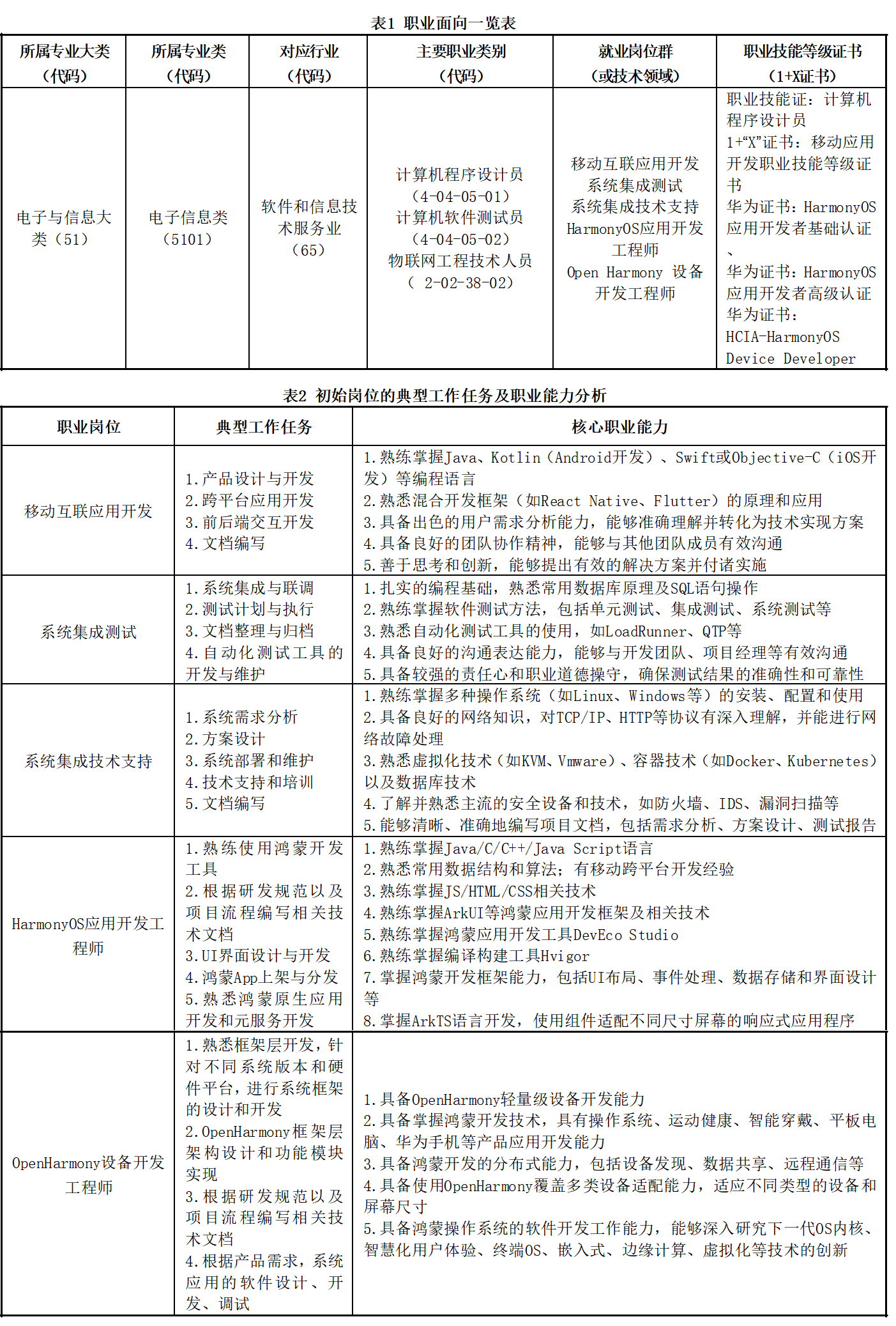 本专业培养德智体美劳全面发展,适应京津冀协同发展需要,掌握扎实的科学文化基础和移动互联设备选型、HarmonyOS应用开发技术、OpenHarmony设备互联技术、无线通信技术、数据库配置与管理、测试技术、移动端UI设计、面向对象语言及相关法律法规等知识,具备移动互联产品安装与调试、驱动程序开发、移动端原生APP开发、移动端Web开发、小程序开发、后端框架Restful API开发等能力,具有工匠精神与数字素养,具有信息安全与法律意识,具有团队协作与沟通能力,能够从事移动互联应用软硬件开发、移动互联系统集成、HarmonyOS应用开发、OpenHarmony设备开发、运营与维护等工作的懂经济、会管理的高素质技术技能人才。